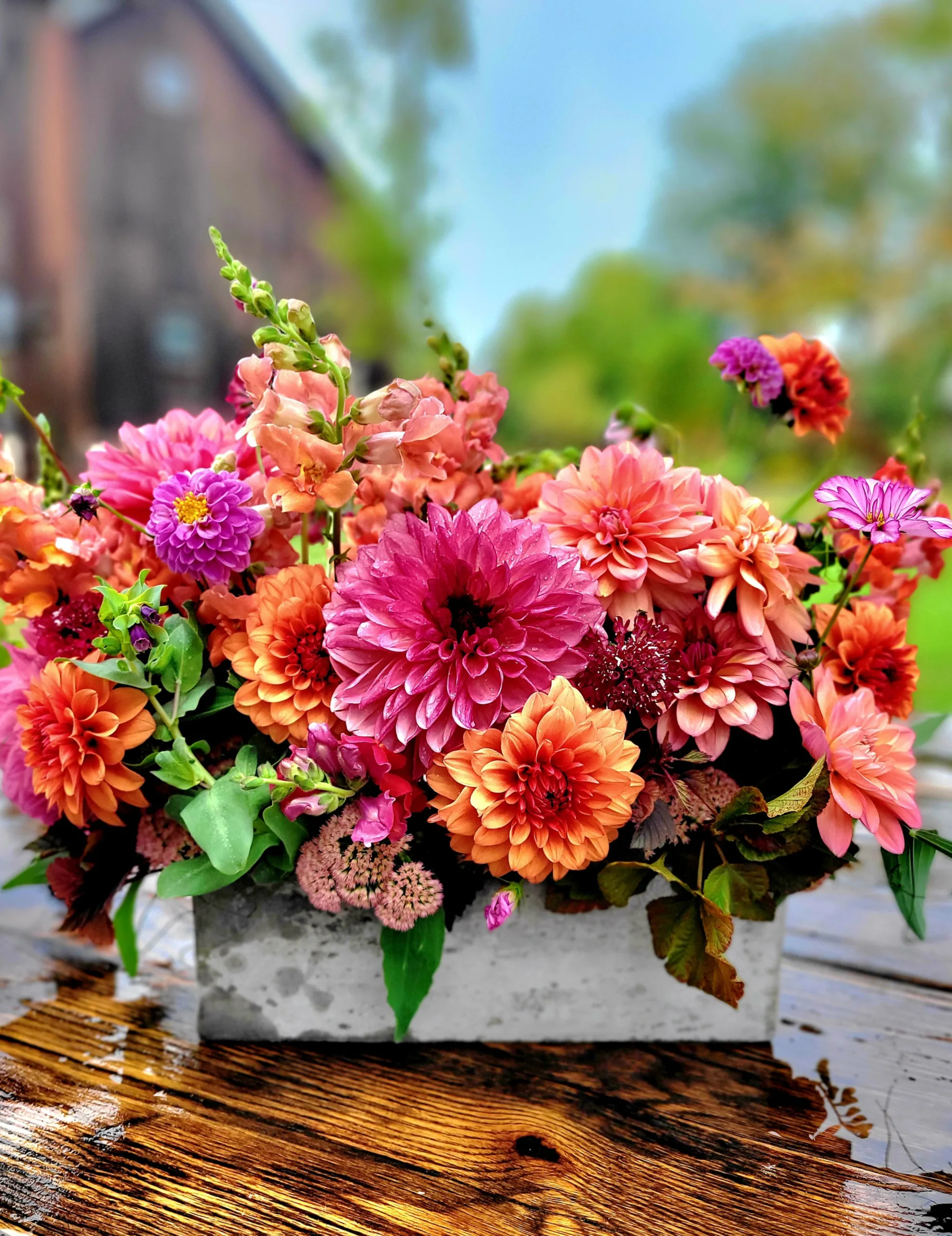 A rustic box, filled with over a dozen focal flowers and seasonal fillers. These boxes are about a foot long and make the perfect table centerpiece!